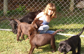 June 4, 2005 – Star whelped nine lovely pups: four choc. girls, one black girl, one choc boy and three black boys. All pups weighed in at one pound, give or take an ounce. We look forward to watching them grow! Star is an awesome little mom and the pups are thriving.